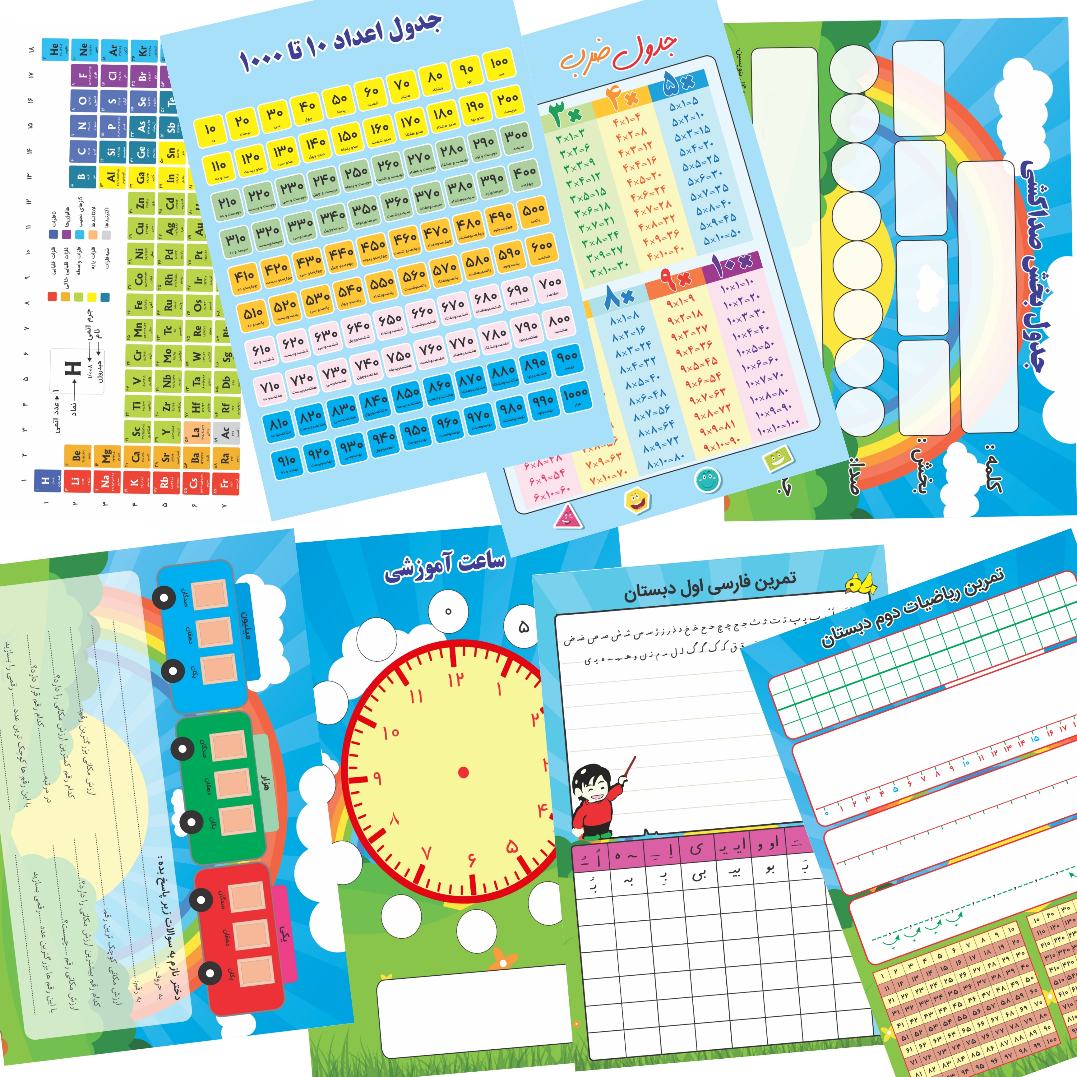 محصولات کمک آموزشی معلم وطنم شامل 15 مدل پوستر آموزشی برای پایه های ابتدایی و تمرین ضرب وتقسیم, مندلیف و... و همچنین کتاب تمرین نوشتار فارسی و تمرین ریاضی برای پایه اول ابتدایی می باشد.