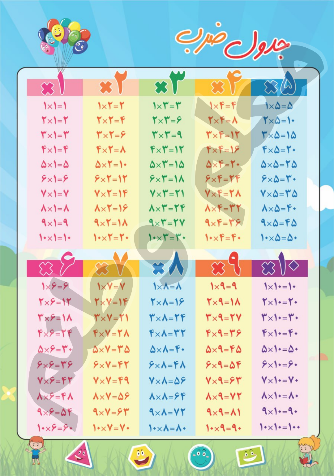 در یک طرف برگه جدول ضرب برای تکرار و تمرین صورت کامل نوشته شده ,پشت برگه هم جدول ضرب بصورت پلکانی به همراه تمریناتی برای نوشتن با ماژیک وایت برد طراحی شده تا دانش آموز در سریع ترین زمان ممکن به جدول ضرب مسلط شود.روی این پوستر راحت با ماژیک بنویس,پاک کن و یاد بگیر. تمرین