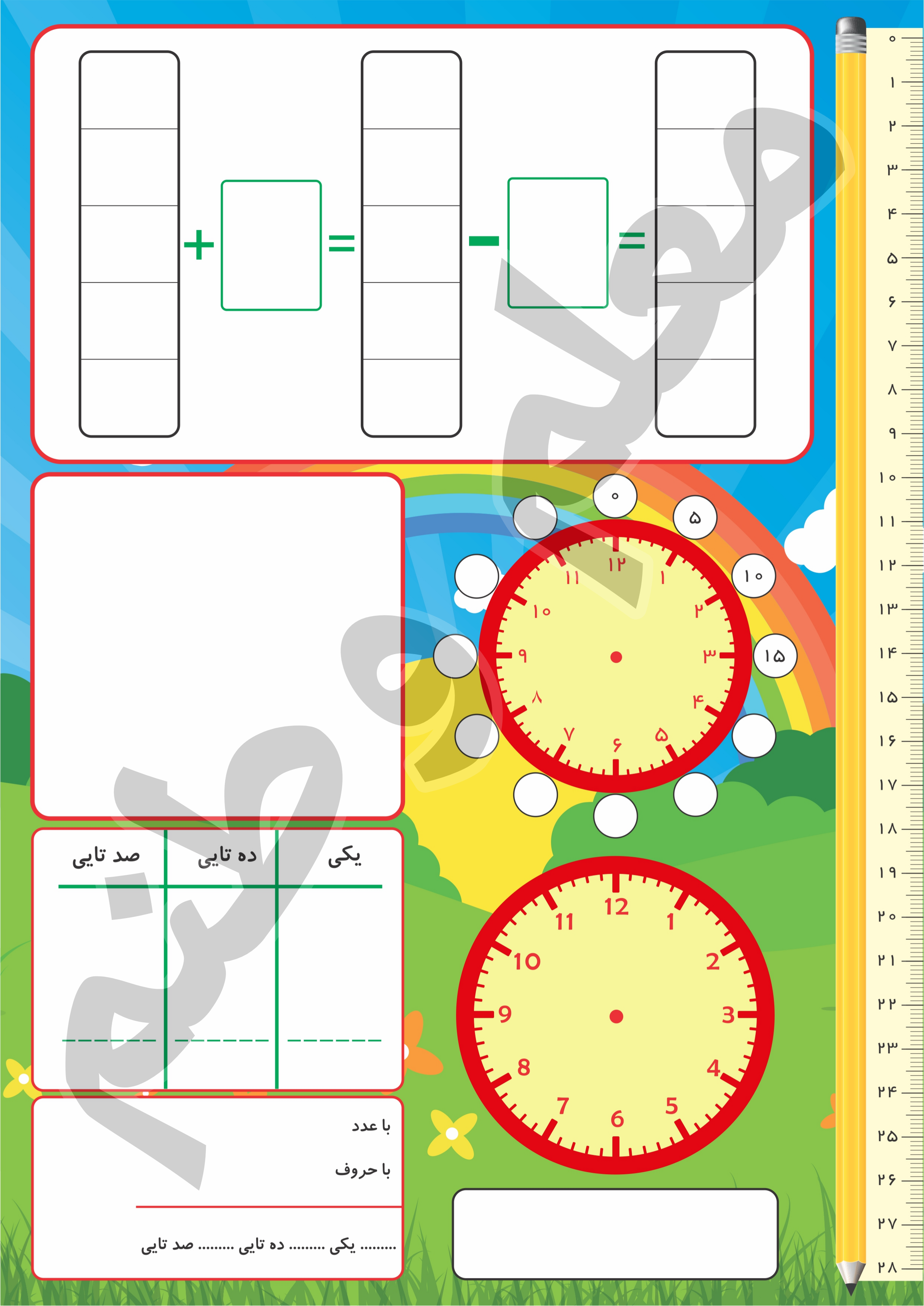 روی این پوستر راحت با ماژیک بنویس,پاک کن و یاد بگیر. تمرین روی محور , جدول اعداد در یک طرف و تمرینات ساعت,یکی ده تایی صدتایی و جمع و تفریق در سمت دیگر این وایت برد , یادگیری رو بسیار آسان و لذت بخش تر میکنه و چون داخل کیف مدرسه جا میشه حملش هم راحته و برای تمرین میتونه همیشه همراهت باشه.